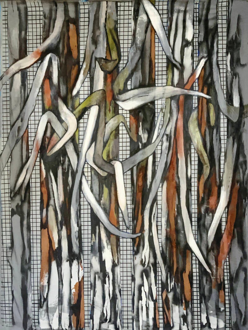 Cortizas de eucalipto con cuadrícula. Peza da exposición Continuo. Tintas acrílicas sobre tea. 280x 220 cm.