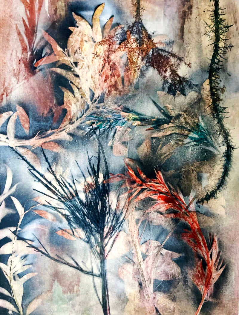 Peza da exposición Natureza alterada. Tintas acrílicas e tintas de gravado. 94x71 cm.