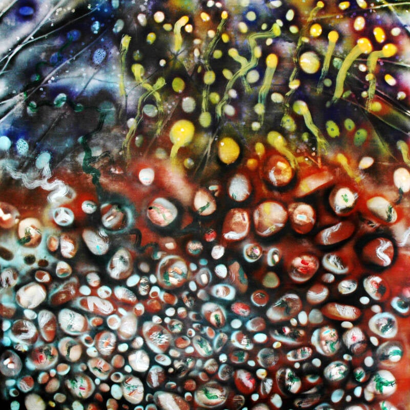 Pedras-luz. Peza da exposición Corpo, natureza e conciencia. Tintas acrílicas e óleo sobre lenzo. 195x195 cm.