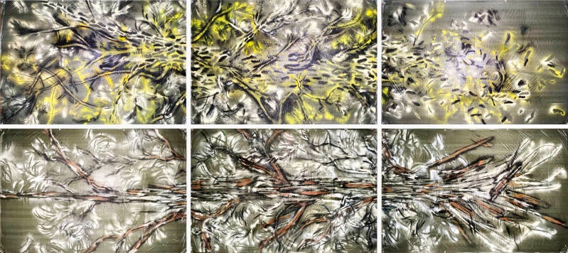 Pino e eucalipto baixo a auga. Peza da exposición XX semana de arte contemporáneo de Asturias. Tintas acrílicas sobre polipropileno. 6 pezas de 2x3 metros cada unha.